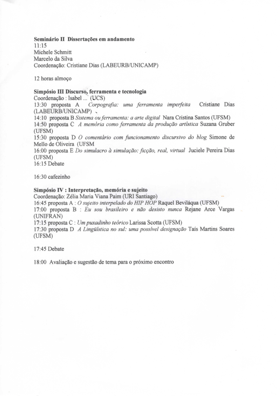 XIX Seminário Corpus – “Língua e Ideologia” e “Dez jornadas de trabalho ao longo do 2° semestre de 2012”